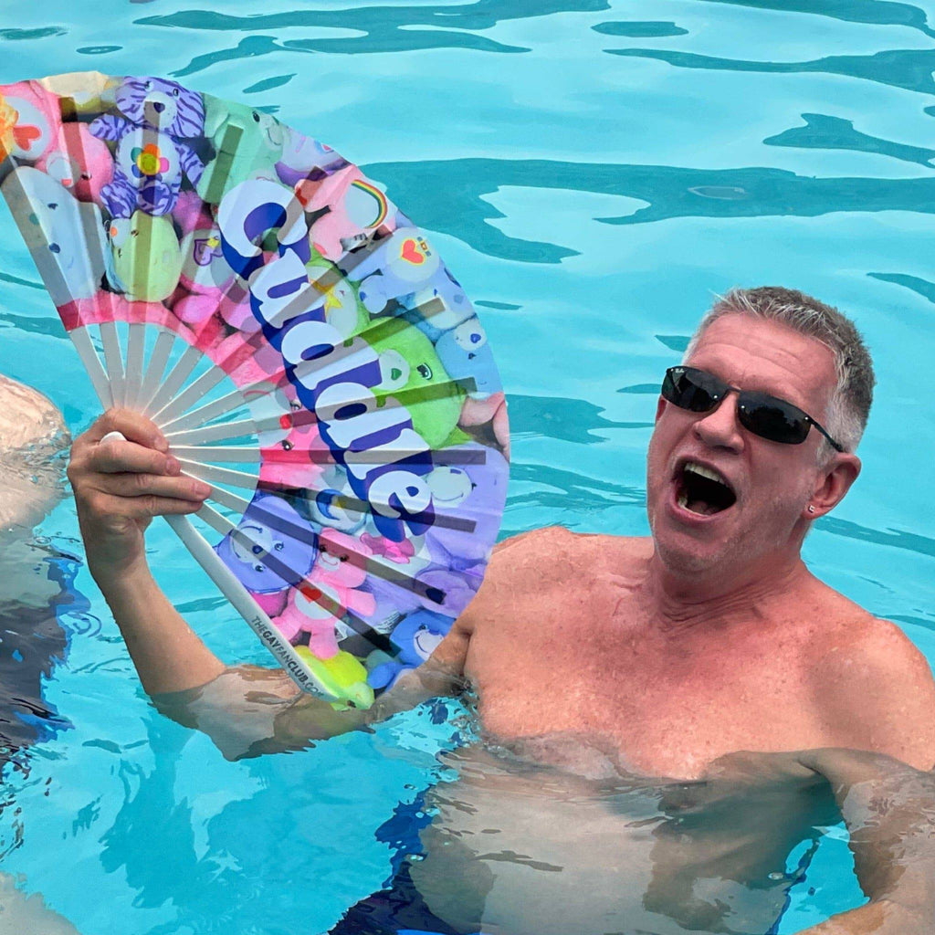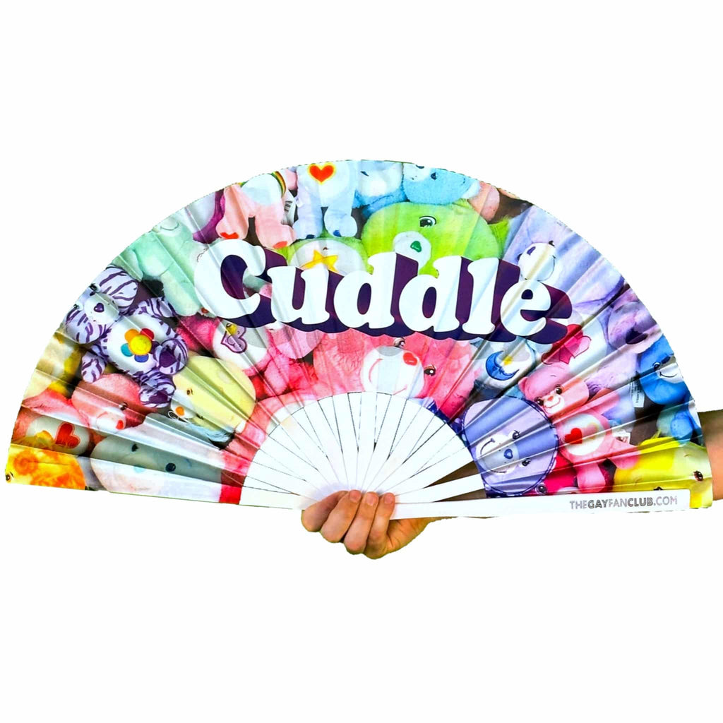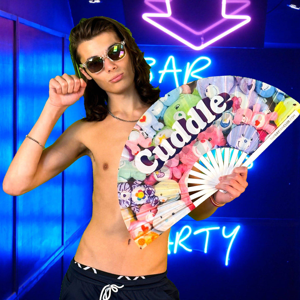 The Cuddle Bear Fan is a UV-reactive hand fan with a loving nod to the bear community, blending cozy vibes with vibrant colors that shine under blacklight. Perfect for raves, Pride festivals, and more, this bamboo hand fan is made for those who embrace their size, strength, and spirit with pride.