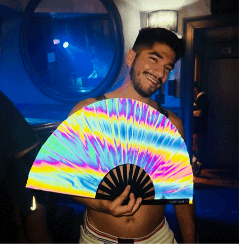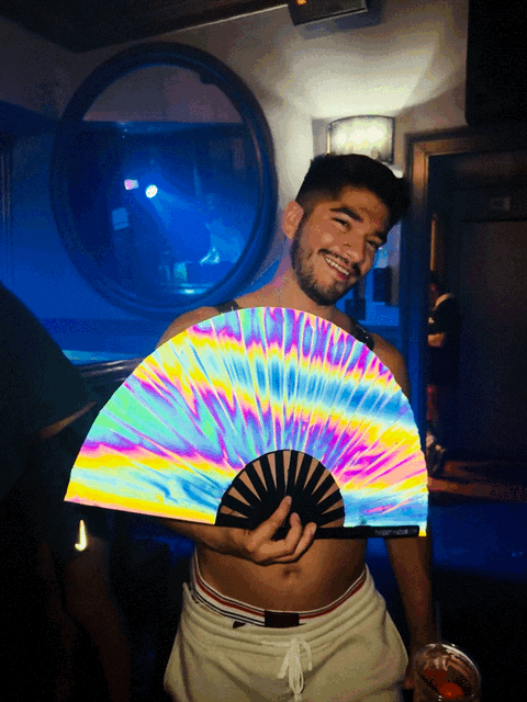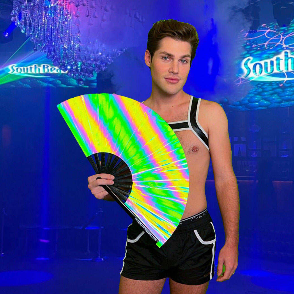 The Eclipse Reflective Fan is a top selling metallic hand fan for raves that changes colors in a flash 📸. This deluxe bamboo and fabric hand fan appears black until a flash reveals the bold, dazzling rainbow design beneath. Perfect for those who love to keep ’em guessing at Pride, raves, or late-night drag brunches. When the spotlight hits, this hand fan clacks loud and clear.