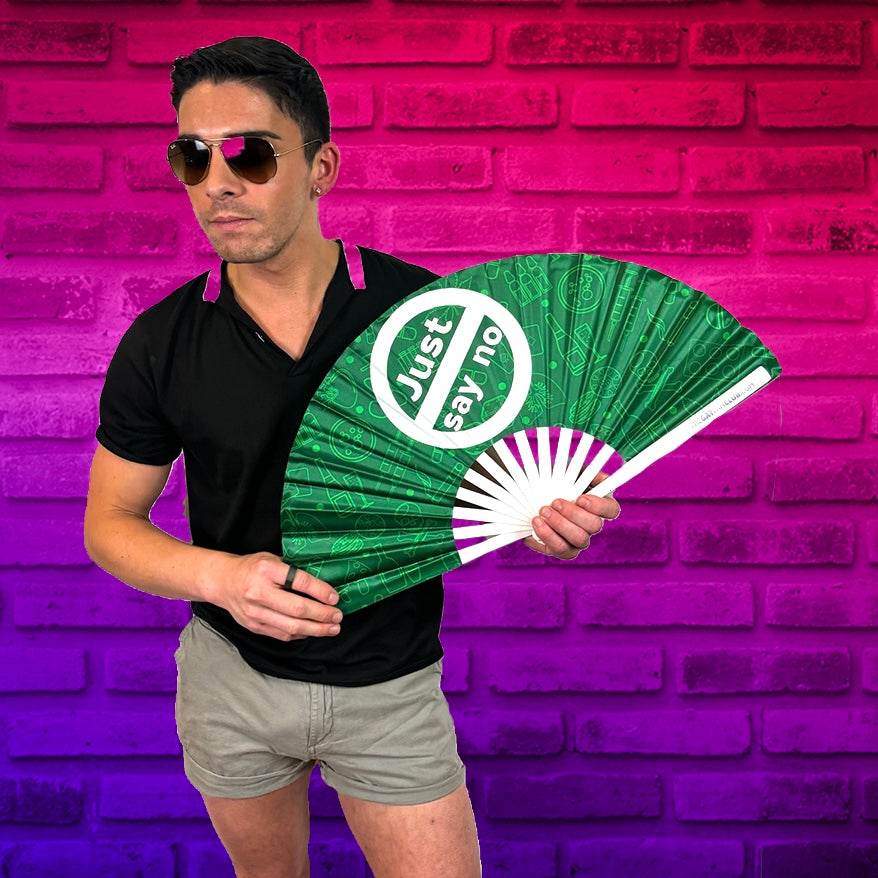 The Just Say No Fan is a green and white bamboo hand fan for raves and a bold nod to Nancy Reagan’s 1980s catchphrase — now repurposed with a whole lot more queer flair. This clack fan sets boundaries with style and lets everyone know where you stand (which is far away from bad vibes). Perfect for raves, and music festivals, or simply brushing off unsolicited energy with one dramatic clack.