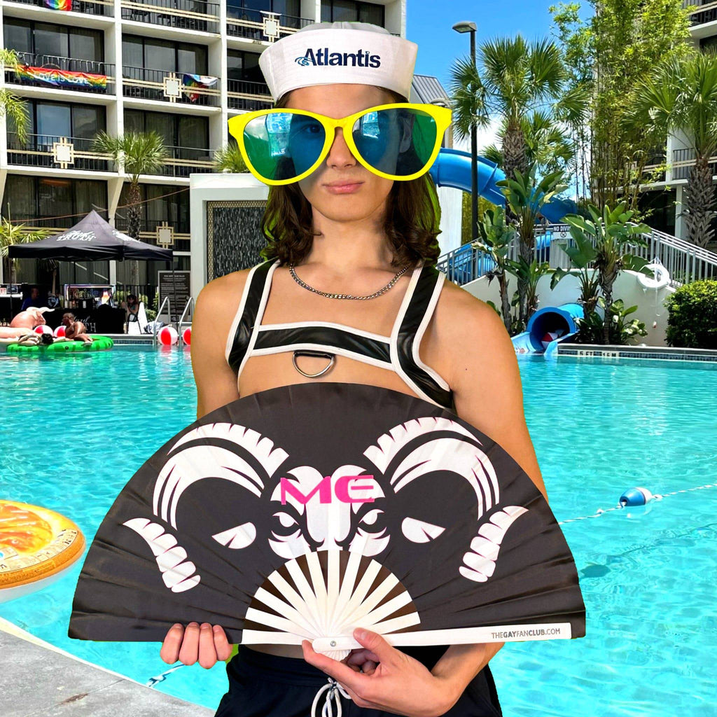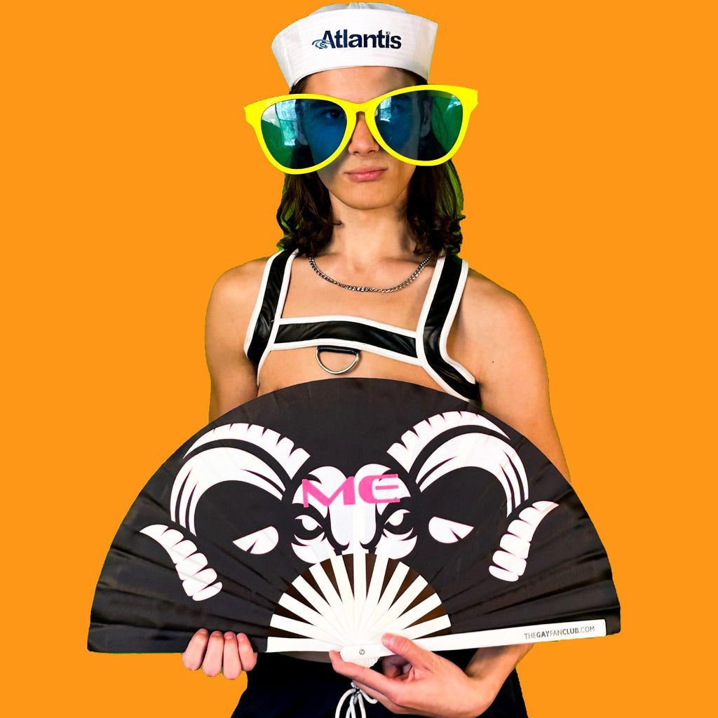 The Ram Me Fan is a UV-reactive bamboo hand fan for raves bringing vibrant colors and a playful edge, perfect for raves. With its cheeky design, this black and white hand fan is made for fans who love to keep things fun, flirty, and just a little bit naughty — all while glowing bright.