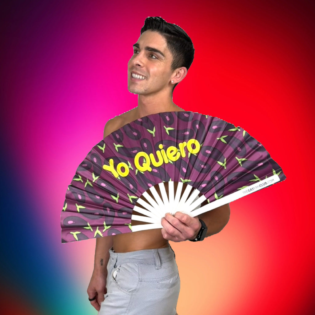 The Yo Quiero Fan is a purple bamboo hand fan with eggplant emojis giving full-on ‘90s nostalgia with a spicy twist. This clack fan is perfect for raves, drag brunch, or whenever you’re feeling bilingual and bold. Whether it’s a snack, a flirt, or just the spotlight, this fan says exactly what you want… with a loud, snappy twist.
