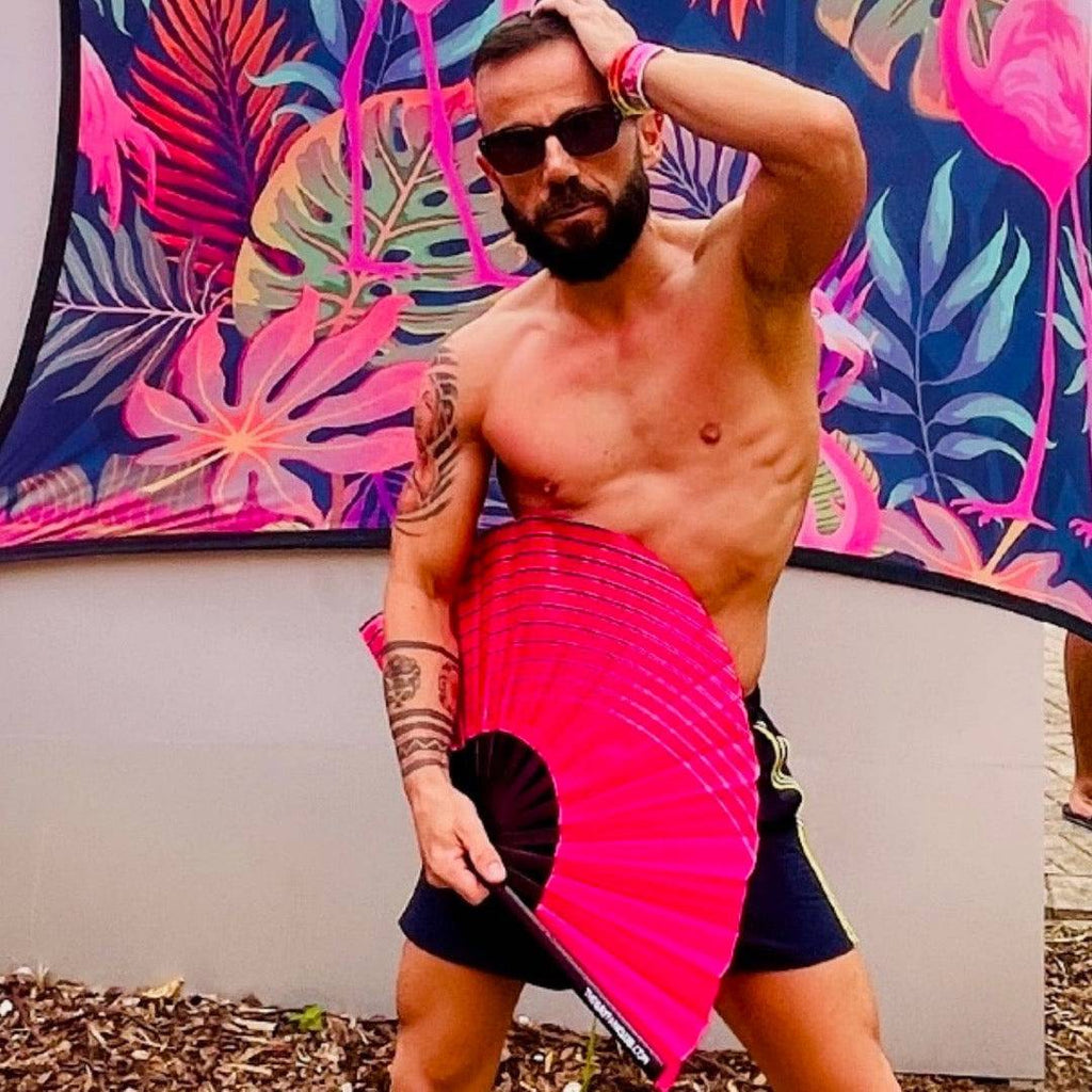 The Wave Fan is a hot-pink UV-reactive rave fan made for those who flow with the beat and shine under the lights. Whether you’re making waves at Pride, lighting up the rave, or owning the dance floor, this bamboo hand fan clacks loud and shines brightly — a true symbol of movement.